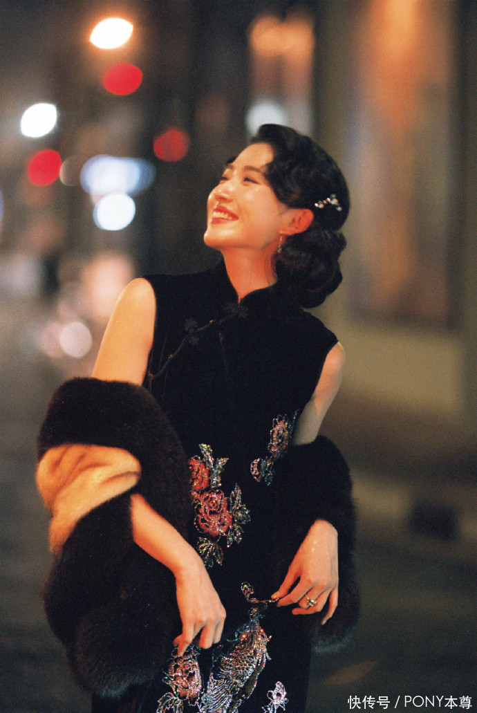 黑色无袖丝绒面料的旗袍裙和卢昱晓的适配度也超高!黑色丝绒面料搭配刺绣装饰,显白显气质!