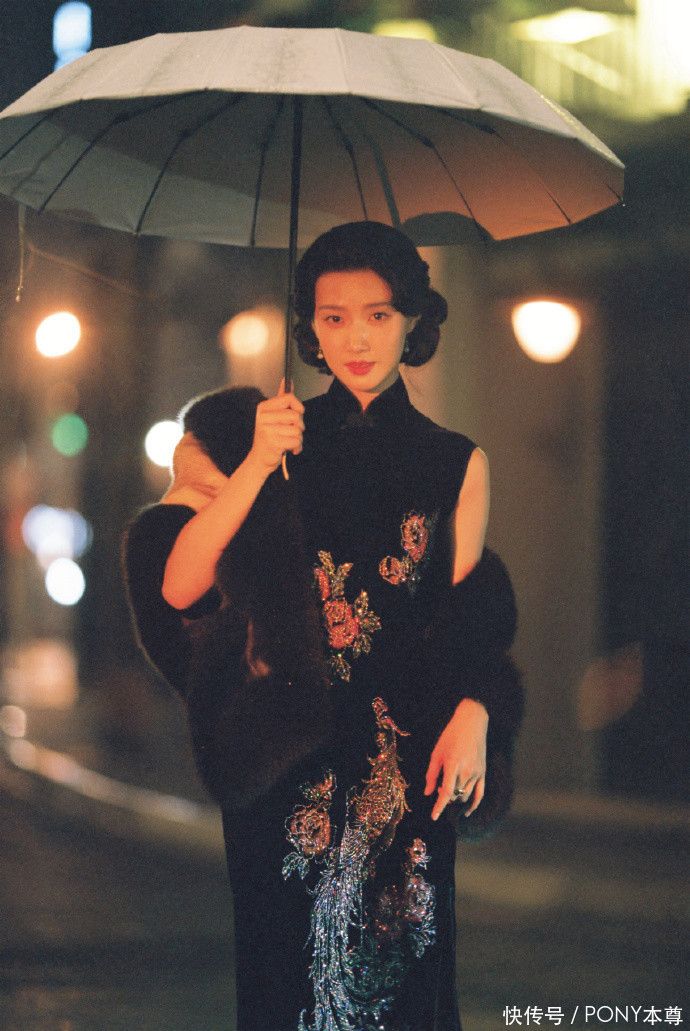 搭配复古盘发造型和珍珠耳环,旗袍裙外搭配毛领装饰的披肩,手撑伞款款走来,让人忍不住多看几眼!